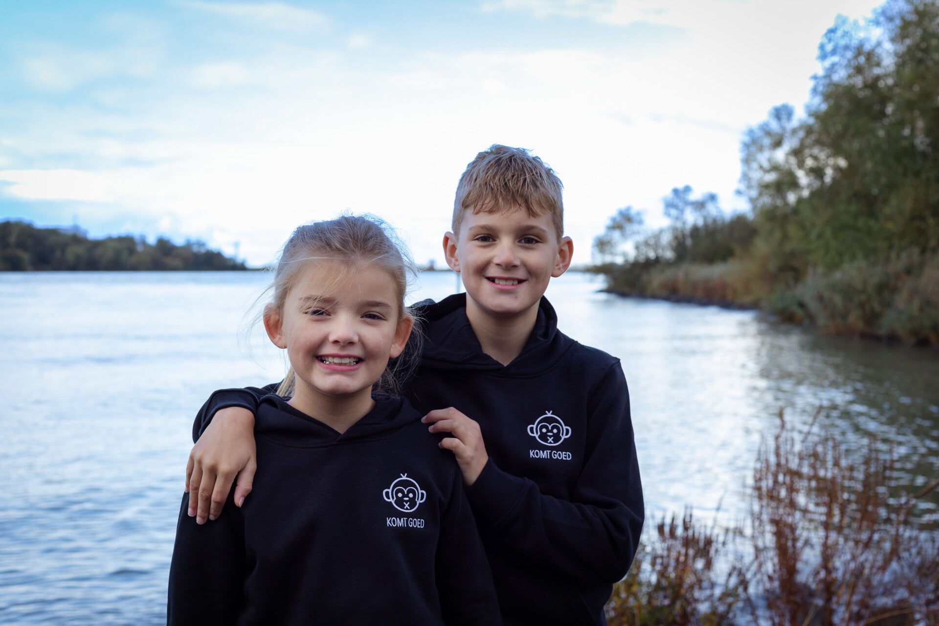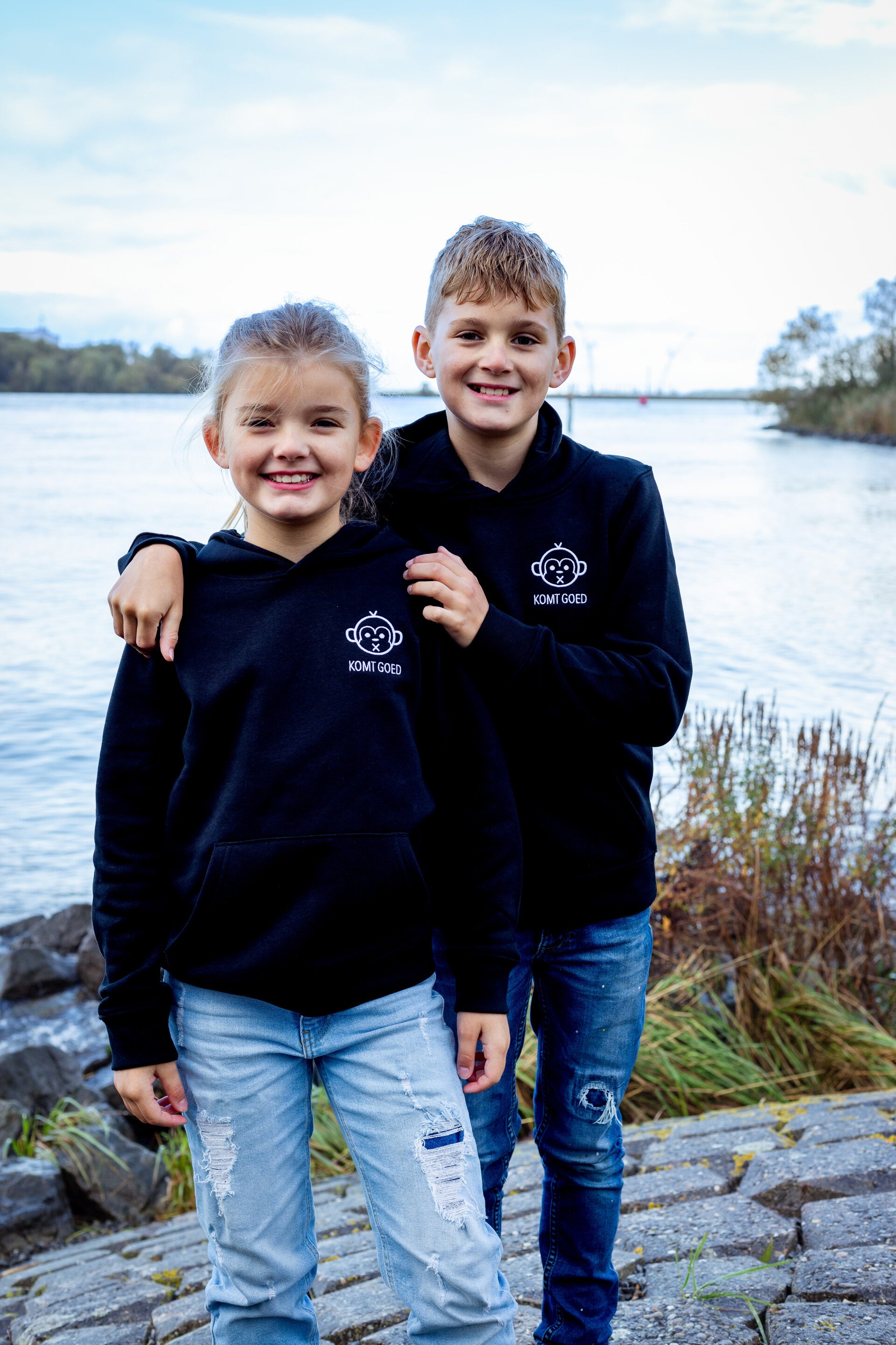 Olivier is 1.45 m en draagt maat 9/11 jaar van de Hoodie & Amber is 1.35 m en draagt maat 9/11 jaar van de Hoodie.