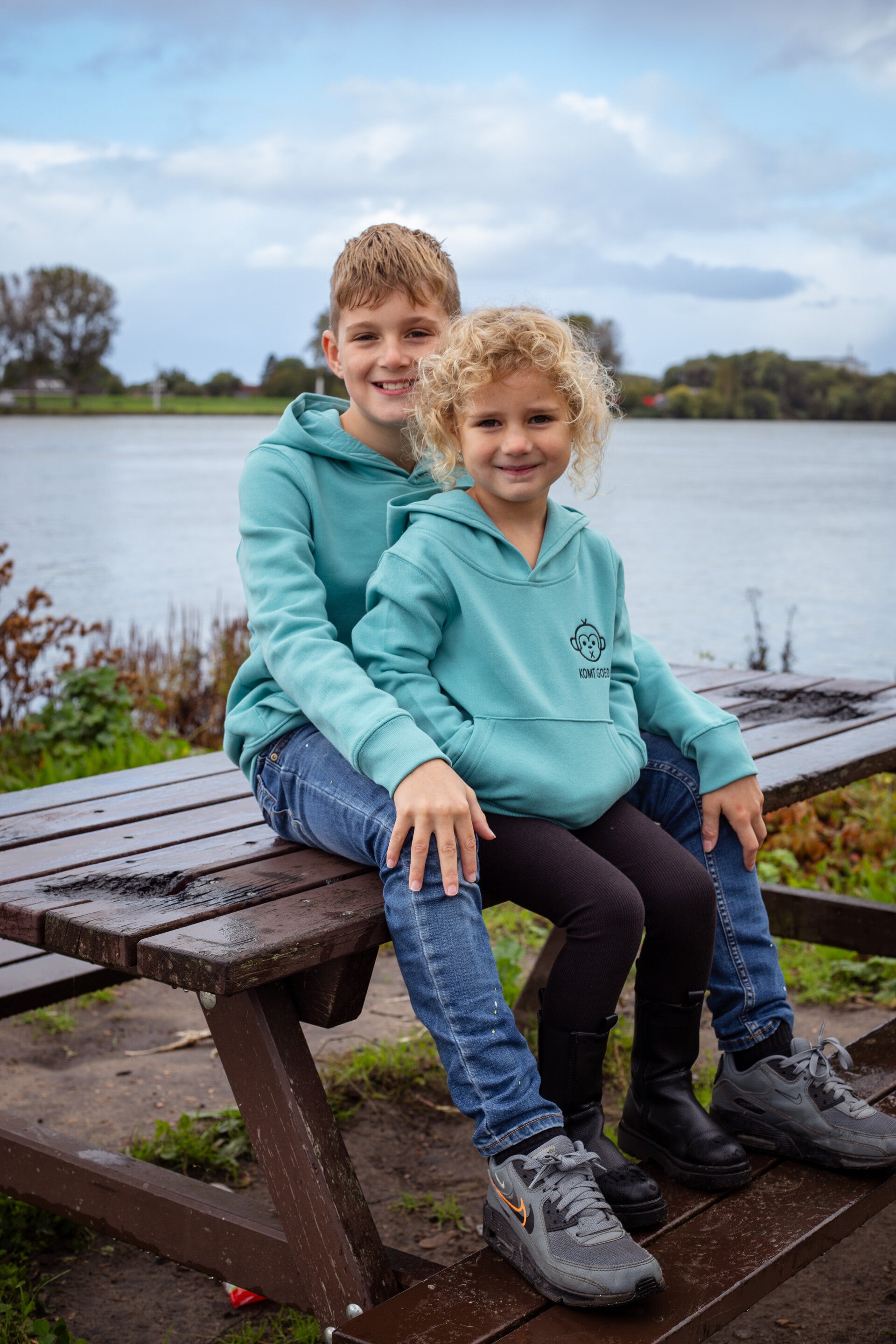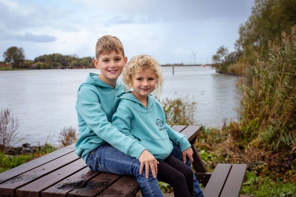 Olivier is 1.45 m en draagt maat 9/11 jaar van de Hoodie & Lizzy is 1.10 m en draagt maat 3/4 jaar van de Hoodie.